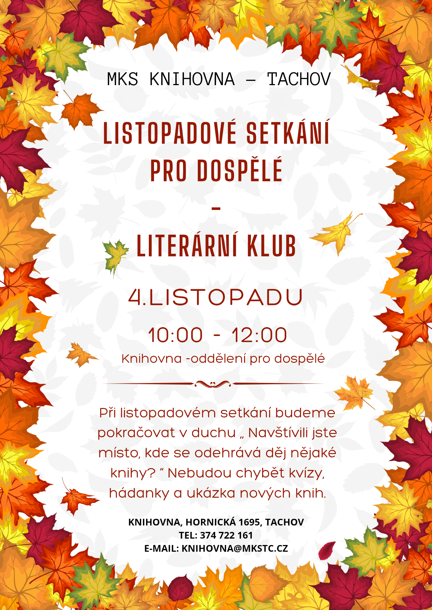 Pro návštěvníky pravidelného setkávání bude jako obvykle připravena ukázka a doporučení nových knih. Při říjnovém setkání jsme společně otevřeli téma: “Navštívili jste místo, kde se odehrává děj nějaké knihy?“ Takže další program bude pokračovat v tomto duchu. Nebudou chybět další kvízy a hádanky.