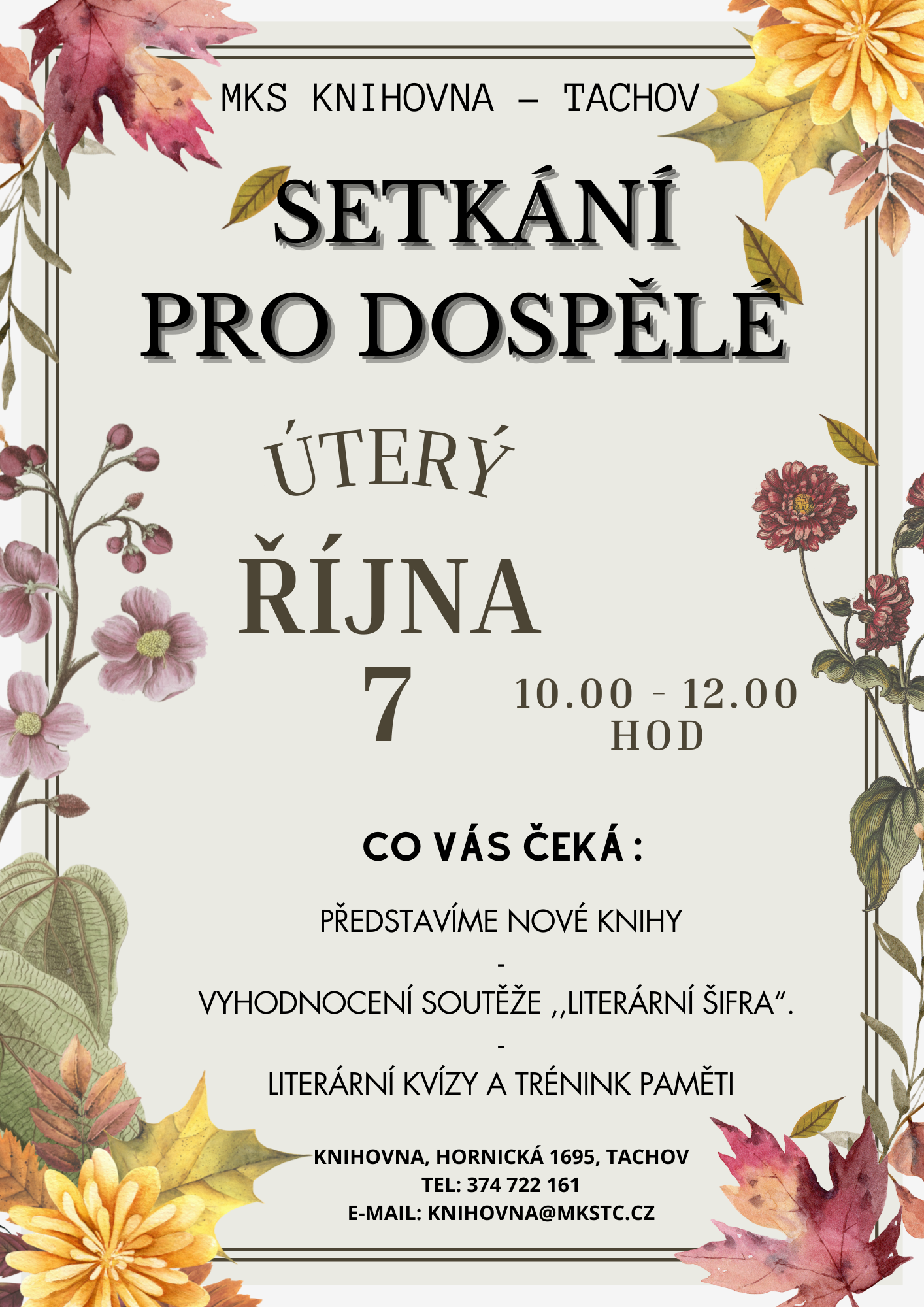 Příznivci pravidelného setkávání se mohou těšit na ukázku nových knih, při které se dozví zajímavosti o nových titulech a jejich autorech. Pro milovníky kvízů a hlavolamů jsou připraveny různé úkoly pro trénink paměti. Součástí programu bude také vyhodnocení soutěže Literární šifra.