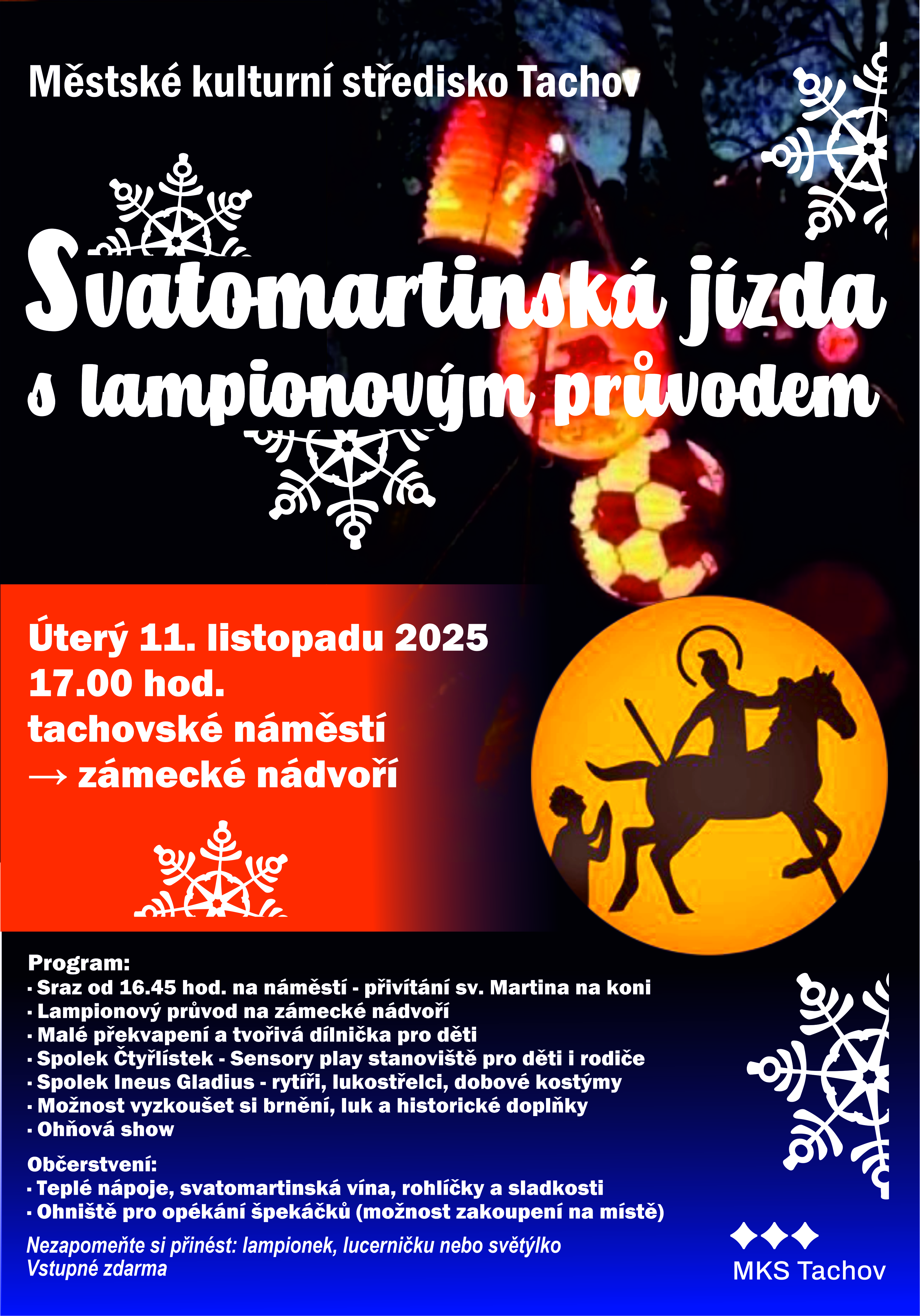 Sraz je od 16.45 hod. na náměstí kde bude čekat svatý Martin na koni. Za ním se vydáme asi kilometrovou trasou směrem na zámecké nádvoří, kde bude připraven pestrý program.